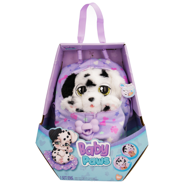 Die Baby Paws Hundewelpen sind die süßesten Hündchen aller Zeiten, die es lieben, von dir herumgetragen und gekuschelt zu werden. Nimm sie mit, wohin du auch gehst, und kümmere dich um sie wie um ein richtiges Hundebaby! Wenn du ihnen ihren Schnuller aus dem Mund nimmst, kannst du beobachten, wie sie zum allerersten Mal ihre Augen öffnen und dabei superniedliche Laute von sich geben. Sooo süß! Öffne ihre Schmusedecke und nimm deinen kuschelig weichen Welpen gleich auf den Arm, denn die Baby Paws brauchen ganz viel Liebe und Zuneigung. Natürlich lieben es die Welpen auch mit dir herumzutollen. Ist dein Hündchen dann vom vielen Spielen müde geworden, gib ihm einfach seinen Schnuller zurück und er wird zufrieden einschlafen. Zum Herumtragen deines Hundebabys kannst du ihn übrigens einfach in seine Schmusedecke packen, die zugleich eine Tragetasche mit Griff ist. So hast du deinen Liebling immer ganz nah bei dir! Insgesamt gibt es drei Charaktere zur Auswahl: einen Cocker Spaniel-, einen Dalmatiner- und einen Husky-Welpen.