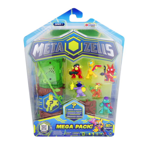 Metazells son las nuevas increíbles figuras coleccionables basadas en animales guerreros. Hay más de 80 personajes diferentes para coleccionar, incluyendo figuras comunes, especiales, rares y ultra rares. Inlcuye 7 figuras (una especial garantizada) y sus 7 cartas, 2 troncos, 2 accesorios conectables y un folleto. Construye tu propio mundo de Metzaells con los troncos y accesorios y completa la colección más rápido con este pack. ¡Encontrarás un personaje especial de la serie!