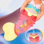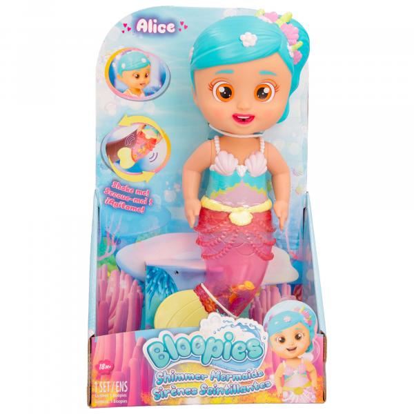 Conoce a la Shimmer Mermaid Alice. Su cola roja transparente está llena de amuletos brillantes. Sepárala de su cuerpo, llénala de agua, vuelve a colocar su cola de sirena y mira cómo se mueven los amuletos dentro de la cola. Alice tiene un cuerpo blandito de plástico y, al apretarlo, lanza chorritos de agua por la boca.
