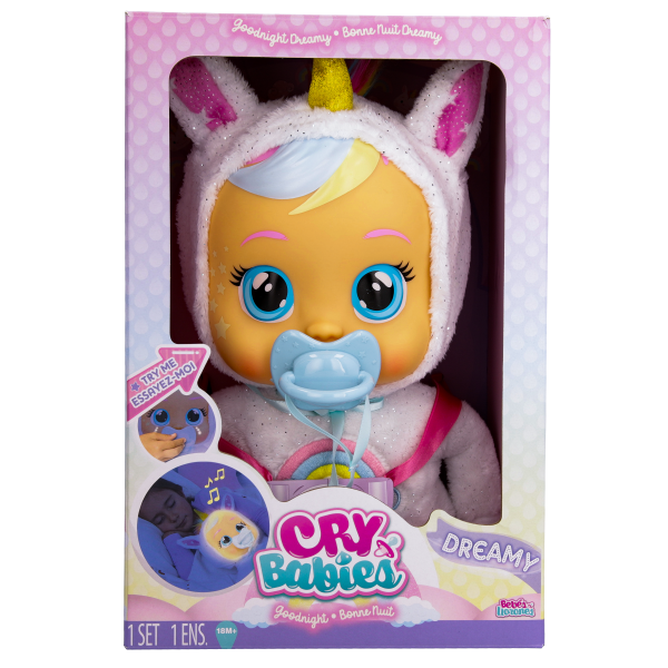 La Cry Babies Goodnight Dreamy è la compagna perfetta per la nanna! Super morbida per tante coccole e bellissima. Per non bagnare il lettino, piange lacrime LED con suoni realistici di bebè quando le togli il ciuccio. Quando glielo rimetti, il suo viso si illumina come una tenera e rassicurante luce notturna. Se le premi il pancino, suona anche 10 minuti di dolci ninna nanne. Magici sogni d’oro con Dreamy!